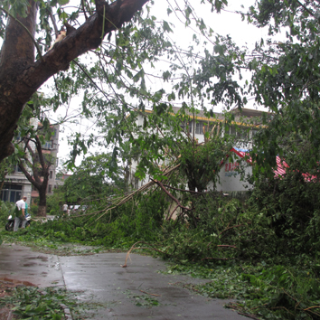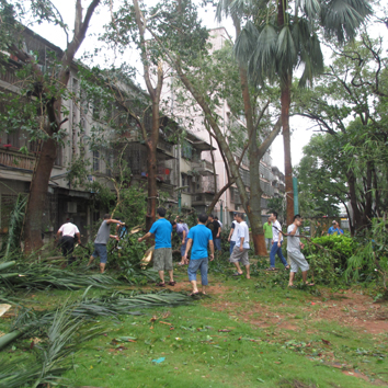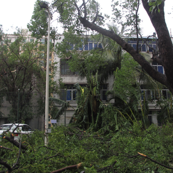 7月18日,第9號臺風(fēng)“威馬遜”登陸海南,經(jīng)過近一夜狂風(fēng)怒號,我院如同災(zāi)難片場景:滿目瘡痍,一片狼藉。大量樹木倒塌,壓到我院十多輛車,也造成我院道路堵塞,停水停電,給全院職工的生活及工作帶來不便。
